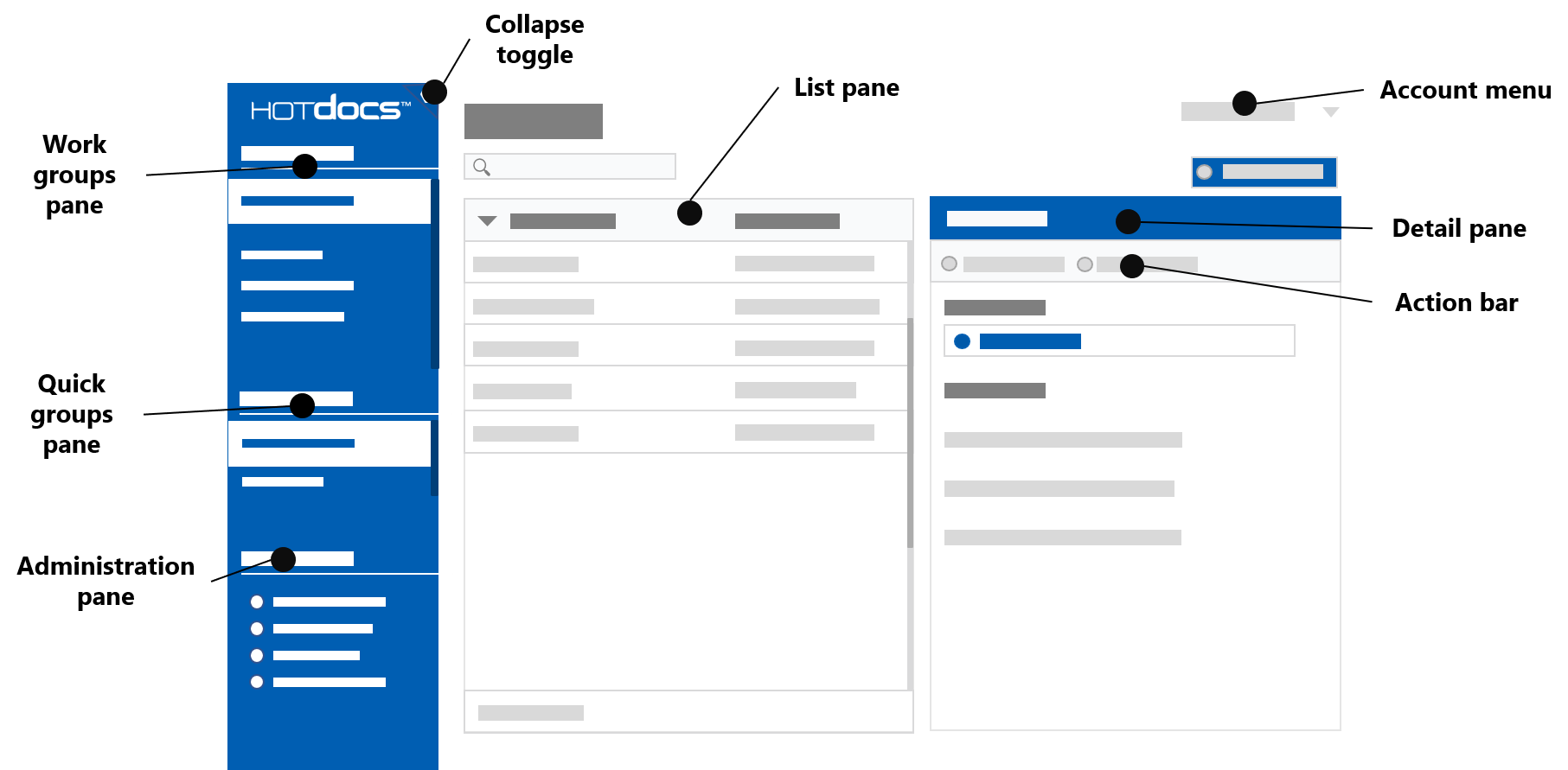 The HotDocs Advance browser-based user interface has the following components: