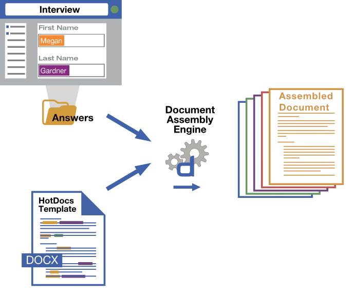 Document Assembly is the HotDocs process that produces an assembled document by processing HotDocs instructions and replacing placeholder fields in the template with answer data. For example, document assembly is a background process that runs when your template users finish an interview on HotDocs Advance and when you finish testing a template in Author.