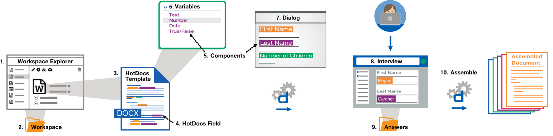 in the order in which they occur in the basic HotDocs workflow.