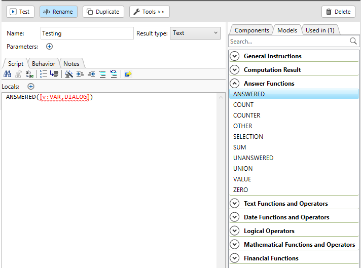 When writing a script (whether a computation or a dialog script), you can find the Models tab to the right of the Script tab. Once you determine the name of the function or instruction you want to use to achieve your goals, you can drag and drop the model for that item directly onto the Script tab. Once there, you can select any placeholder that model may have, then either type the expected item, or drag that item from either the Component tab, or if appropriate, another model from the Models tab.