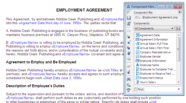 When you create a new template file, HotDocs automatically creates a companion file called the component file. The component file contains information about variables and other components used in the template. Both the template file and the component file are necessary for a template to work. Whenever you copy a HotDocs template—for example, to share a template with another user—you must be sure to copy both the template file and the component file.