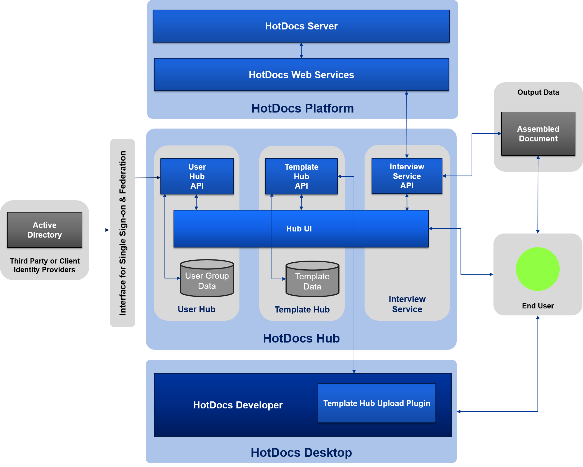 - User Hub – authentication and authorization for accessing HotDocs resources (i.e. templates, Interviews, Hub administrative tools).